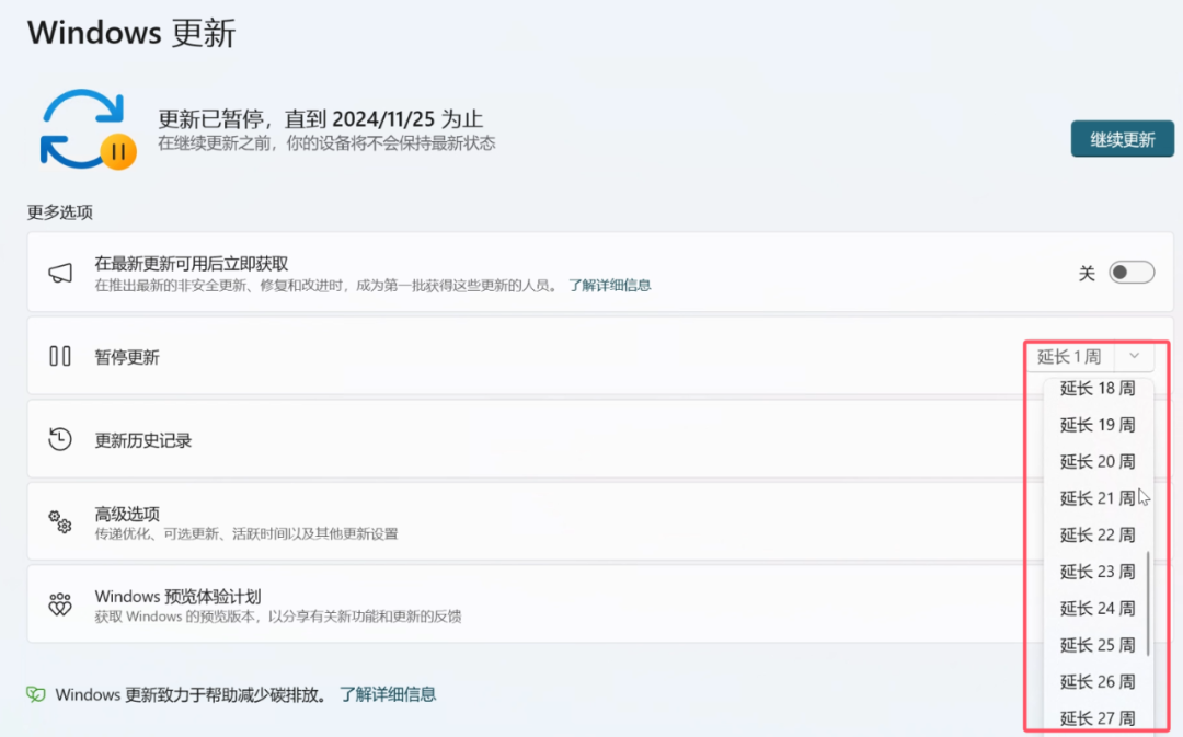 出現(xiàn)操作成功的提示后,來到“windows更新”界面,選擇你需要暫停更新的天數(shù)。