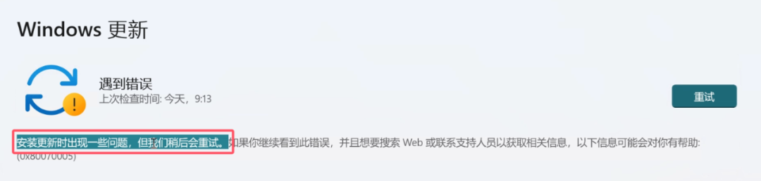 然后回到“windows更新”界面點(diǎn)更新,會(huì)出現(xiàn)報(bào)錯(cuò),這樣也實(shí)現(xiàn)了關(guān)閉系統(tǒng)自動(dòng)更新