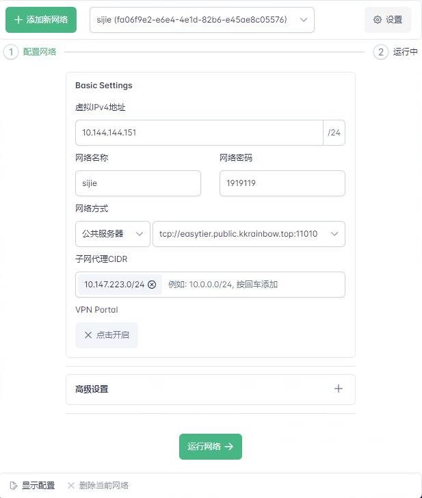 sudo easytier-core -i 10.144.144.1 --network-name abc --network-secret abc -e tcp://public.easytier.top:11010