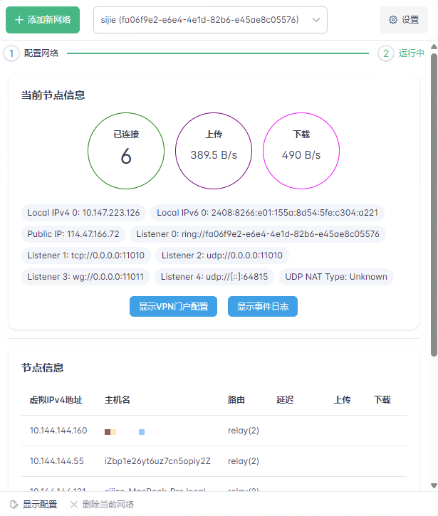 其中 --peers 參數(shù)可以填寫(xiě)任意一個(gè)已經(jīng)在虛擬網(wǎng)絡(luò)中的節(jié)點(diǎn)的監(jiān)聽(tīng)地址。