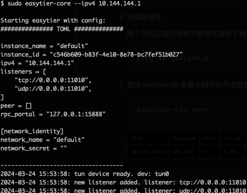 sudo easytier-core --ipv4 10.144.144.1 命令執(zhí)行成功會(huì)有如下打印。