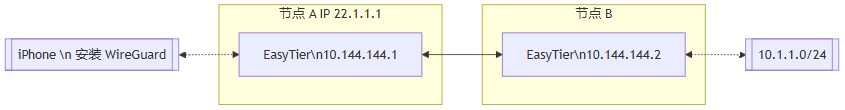 我們需要 iPhone 通過(guò)節(jié)點(diǎn) A 訪問(wèn) EasyTier 網(wǎng)絡(luò),則可進(jìn)行如下配置: