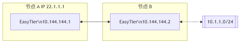 子網(wǎng)代理(點(diǎn)對(duì)網(wǎng))配置 假設(shè)網(wǎng)絡(luò)拓?fù)淙缦?,?jié)點(diǎn) B 想將其可訪問(wèn)的子網(wǎng) 10.1.1.0/24 共享給其他節(jié)點(diǎn)。