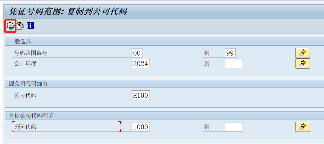 在一張憑證被過(guò)帳前,必須為憑證類型設(shè)置一個(gè)號(hào)碼范圍, 這些號(hào)碼可以由系統(tǒng)內(nèi)部生成或由用戶在外部設(shè)定。 3、復(fù)制到公司代碼(OBH1) 定義好一個(gè)公司的全部號(hào)碼段后,可以通過(guò)復(fù)制方式復(fù)制到其它公司 比如,如下是將H100公司2024年財(cái)務(wù)憑證號(hào)碼段(號(hào)碼范圍)復(fù)制到1000公司中
