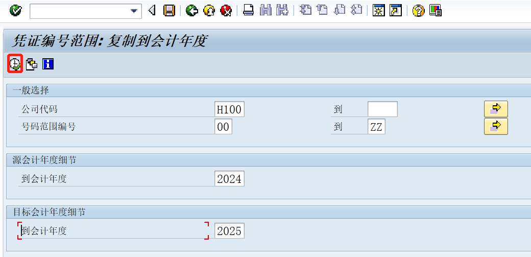 4、復(fù)制到會(huì)計(jì)年度(OBH2) 可以通過(guò)復(fù)制方式將一個(gè)公司舊的會(huì)計(jì)年度的會(huì)計(jì)憑證號(hào)碼段復(fù)制到新的一個(gè)會(huì)計(jì)年度,這個(gè)操作一般在每年年底進(jìn)行維護(hù),確保在新會(huì)計(jì)年度SAP能夠正常運(yùn)行。 比如,如下是將H100公司2024年會(huì)計(jì)憑證號(hào)碼段(號(hào)碼范圍)全部復(fù)制到H100公司2025會(huì)計(jì)年度中。
