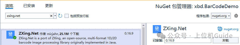 我們通過Nuget搜索zxing.net即可搜索安裝。