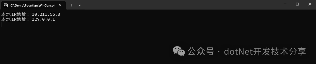 namespace Fountian.WinConsole.IPDemo{ internal class Program { /// <summary> /// /// </summary> /// <param name="args"></param> /// <returns></returns> static async Task Main(string[] args) { string localIP = LocalIPAddress(); Console.WriteLine($"本地 IP 地址: {localIP}"); Console.Read(); } }}