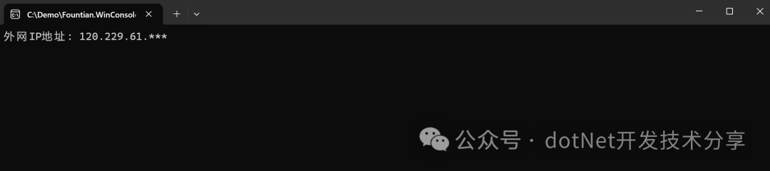 namespace Fountian.WinConsole.IPDemo{ internal class Program { /// <summary> /// /// </summary> /// <param name="args"></param> /// <returns></returns> static async Task Main(string[] args) { string publicIP = await GetPublicIPAddressAsync(); Console.WriteLine($"外網(wǎng) IP 地址: {publicIP}"); Console.Read(); } }}