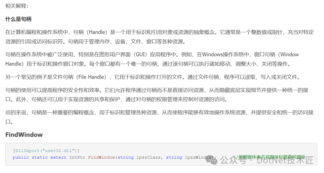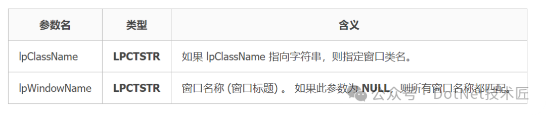 作用:檢索其類名和窗口名稱與指定字符串匹配的頂級窗口的句柄。此函數(shù)不搜索子窗口。此函數(shù)不執(zhí)行區(qū)分大小寫的搜索。若要從指定的子窗口開始搜索子窗口,請使用 FindWindowEx 函數(shù)。