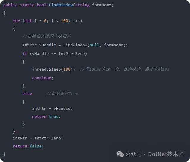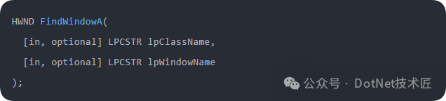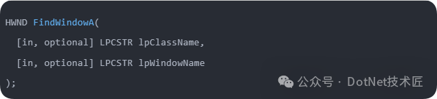 public static extern IntPtr FindWindow(string lpszClass, string lpszWindow); //按照窗體類名或窗體標題查找窗體