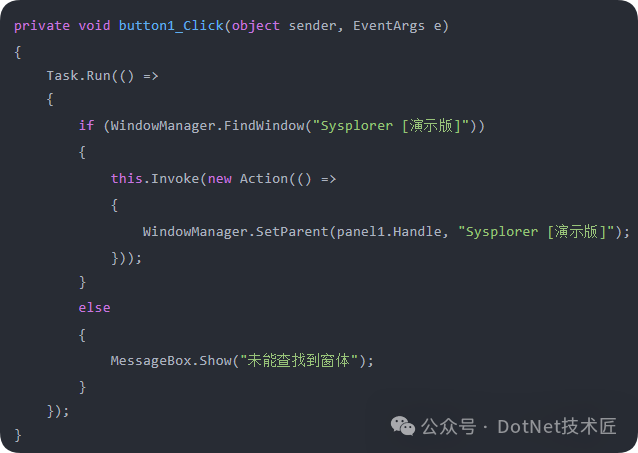 以上就是在Winform中嵌入第三方窗體的一次實踐,希望對你有所幫助。如果你覺得這篇文章對你有幫助,不妨點個贊支持一下!你的支持是我繼續(xù)分享知識的動力。如果有任何疑問或需要進一步的幫助,歡迎隨時留言。也可以加入微信公眾號[DotNet技術(shù)匠] 社區(qū),與其他熱愛技術(shù)的同行一起交流心得,共同成長!作者:mingupupup