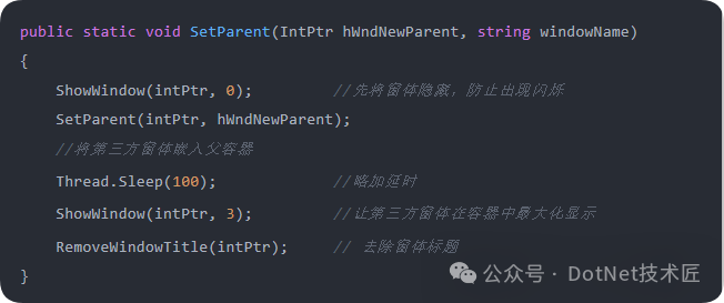 SetParent(intPtr, hWndNewParent); //將第三方窗體嵌入父容器