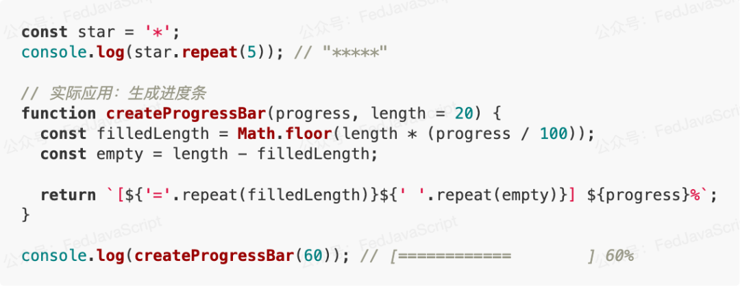 6. repeat - 字符串重復的簡單方案repeat方法讓字符串重復變得簡單直接,常用于生成分隔符、填充字符等場景。