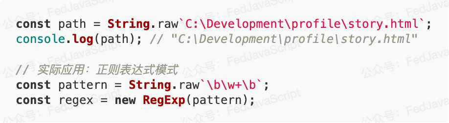 7. String.raw - 原始字符串處理專家處理包含反斜杠的字符串時,String.raw可以避免轉(zhuǎn)義字符的問題,特別適合處理文件路徑、正則表達式等場景。