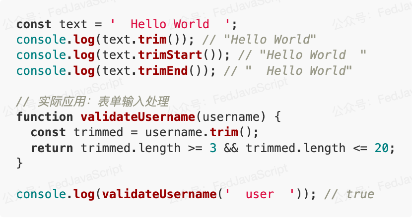 9. trim家族 - 空白字符處理專家trim、trimStart和trimEnd方法提供了完整的空白字符處理解決方案,特別適合處理用戶輸入。