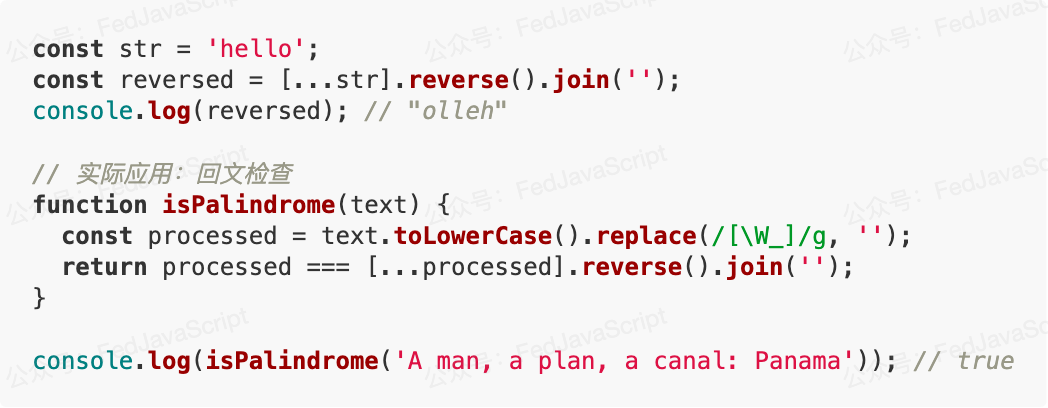 10. 字符串反轉(zhuǎn)終極解決方案使用擴展運算符配合數(shù)組方法可以優(yōu)雅地實現(xiàn)字符串反轉(zhuǎn),這種方法還能正確處理Unicode字符。