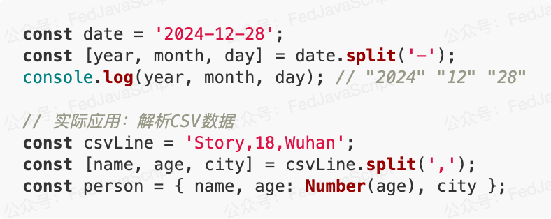 11. split配合解構(gòu) - 優(yōu)雅的字符串解析結(jié)合split和解構(gòu)賦值,可以輕松實現(xiàn)字符串的分割和數(shù)據(jù)提取。