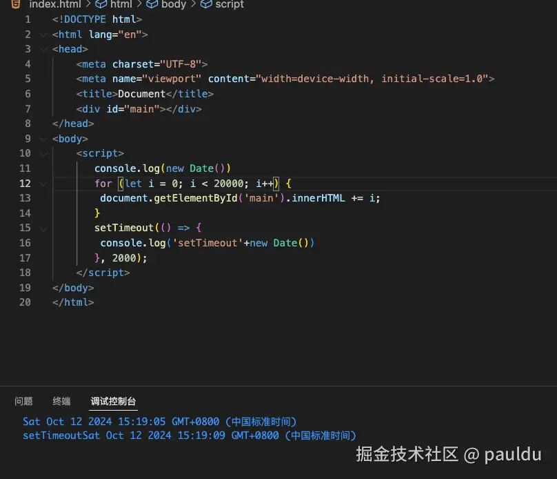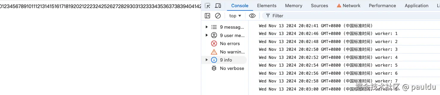 console.log(new Date());  for (let index = 0; index < 20000; index++) {    document.getElementById('main').innerHTML += index;  }  function timer_worker() {    // 創(chuàng)建一個Blob對象,用于生成一個可以在Web Worker中執(zhí)行的JavaScript代碼URL    const blob = new Blob(      [        `let countTime = 0;      self.setInterval(() => { // 在Web Worker的上下文中設(shè)置一個定時器        countTime++; // 每次定時器觸發(fā)時遞增計數(shù)器        self.postMessage(countTime); // 使用postMessage方法發(fā)送計數(shù)器的值到主線程      }, 5000);` // 定時器的時間間隔設(shè)置為1秒      ],      { type: 'application/javascript' }    ); // 指定Blob的內(nèi)容類型為JavaScript    // 使用URL.createObjectURL方法創(chuàng)建一個可以被Web Worker使用的URL    const worker = new Worker(URL.createObjectURL(blob));    // 設(shè)置Web Worker的onmessage事件處理器    // 當(dāng)Web Worker使用postMessage發(fā)送消息時,該處理器會被觸發(fā)    worker.onmessage = (ev) => {      // 更新DOM元素workerDom的文本內(nèi)容,顯示從Web Worker接收到的計時器值      console.log(new Date() + ` worker: ${ev.data}`);    };  }  timer_worker();