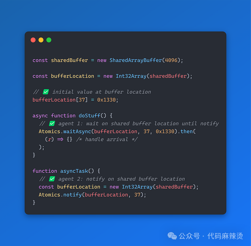 在JavaScript中,Atomics對(duì)象提供了一組靜態(tài)方法,用于在多線程環(huán)境中以原子方式執(zhí)行操作,比如共享內(nèi)存的操作。Atomics.waitAsync()方法允許開(kāi)發(fā)者在異步環(huán)境中等待某個(gè)條件變量達(dá)到特定值,這在并發(fā)編程中非常有用,因?yàn)樗梢员苊庾枞骶€程,同時(shí)等待某個(gè)事件的發(fā)生。 例如:當(dāng)兩個(gè)代理共享一個(gè)緩沖區(qū)時(shí) 而代理 1 則 Sleep",等待代理 2 完成任務(wù)。 當(dāng)代理 2 完成后,它會(huì)使用共享緩沖區(qū)作為通道發(fā)出通知。
