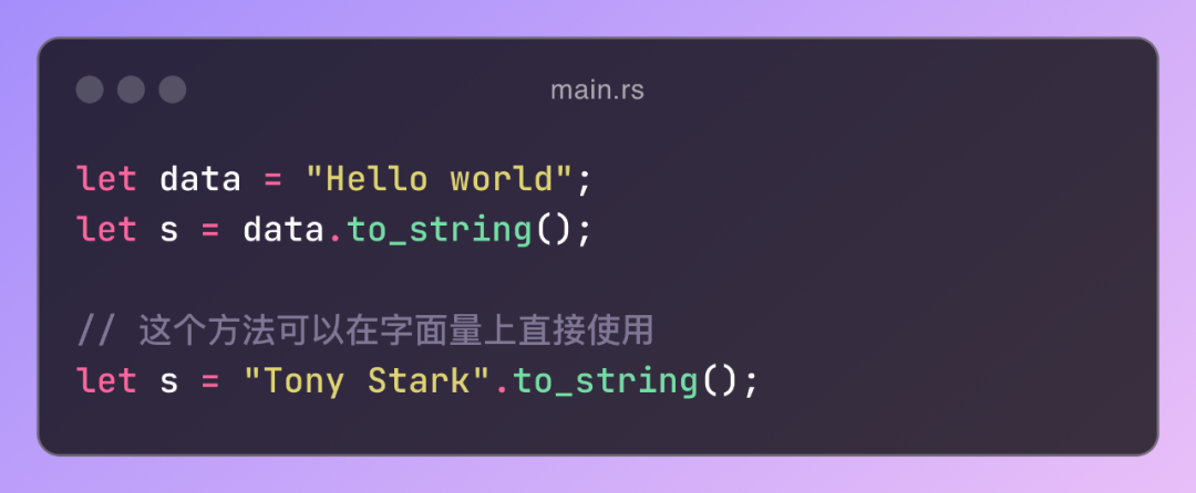 如果想使用現(xiàn)成的字符串初始化 String,可以使用 to_string() 方法。所有實(shí)現(xiàn) Display 特征的類(lèi)型都有這個(gè)方法,比如字符串字面量。