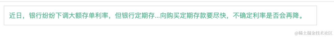 // html代碼<div class="title" id="test"> <span class="content">近日,銀行紛紛下調大額存單利率,但銀行定期存款仍被瘋搶。銀行理財經理表示:有意向購買定期存款要盡快,不確定利率是否會再降。</span></div>