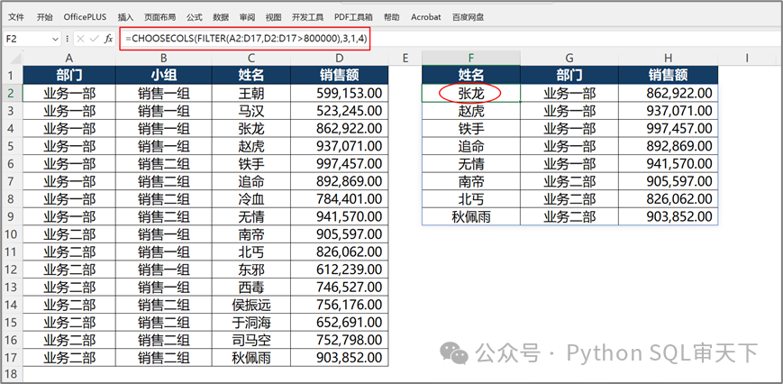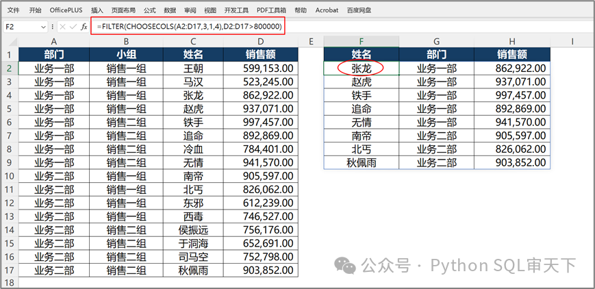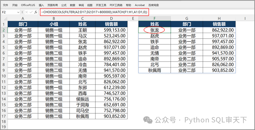 我曾經(jīng)在《未來5年你必須要掌握的函數(shù)之5:FILTER/SORT函數(shù)》這篇文章里,詳細介紹了 FILTER 函數(shù)的基礎(chǔ)運用方法。如果您想深入了解其基本用法,不妨前往一探究竟,相信一定會有所收獲。 今天我們來說說FILTER 函數(shù)在數(shù)據(jù)處理領(lǐng)域的一個超實用技能 —— 精準(zhǔn)篩選不連續(xù)列的條件數(shù)據(jù)。在我看來,這一應(yīng)用場景不僅十分常見,而且在實際操作中,能實實在在地幫助我們提升工作效率,從而快速地從繁雜的數(shù)據(jù)中提取出關(guān)鍵信息。 測試數(shù)據(jù)如下(本人喜歡看武俠小說,所以舉例都喜歡用武俠小說的人名): ![]() 現(xiàn)在我想從上述表格中篩選出銷售額大于 800,000.00 的數(shù)據(jù)記錄,且僅需獲取姓名、部門以及銷售額這三列數(shù)據(jù)。然而,此三列在表格中并非連續(xù)排列,那我們?nèi)绾芜\用FILTER 函數(shù)來進行精準(zhǔn)篩選,以滿足這一特定的數(shù)據(jù)提取需求呢? 方法一:利用FILTER函數(shù)結(jié)合HSTACK函數(shù) =FILTER(HSTACK(C2:C17,A2:A17,D2:D17),D2:D17>800000) 首先利用HSTACK函數(shù)把姓名、部門和銷售額這三列按照從左到右的順序水平合并成一個新數(shù)組,然后利用FILTER函數(shù)按照條件對銷售額進行篩選。關(guān)于HSTACK函數(shù)的基本用法可以參考《未來5年你必須要掌握的函數(shù)之4:HSTACK/VSTACK函數(shù)》。 ![]() 方法二:利用FILTER函數(shù)結(jié)合CHOOSECOLS函數(shù) =FILTER(CHOOSECOLS(A2:D17,3,1,4),D2:D17>800000) 先使用CHOOSECOLS函數(shù)篩選出所需要的列,姓名(在第3列)、部門(在第1列)、銷售額(在第4列),然后使用FILTER函數(shù)按照條件對銷售額進行篩選。關(guān)于CHOOSECOLS函數(shù)的基本用法可以參考《未來5年你必須要掌握的函數(shù)之13:CHOOSEROWS/CHOOSECOLS函數(shù)》。 ![]() 方法三:利用CHOOSECOLS函數(shù)結(jié)合FILTER函數(shù) =CHOOSECOLS(FILTER(A2:D17,D2:D17>800000),3,1,4) 其實這個方法和方法二是類似的,只不過是先用FILTER函數(shù)按照條件篩選了銷售額,然后再利用CHOOSECOLS函數(shù)篩選所需要的列,感覺挺有意思的。 ![]() 方法四:利用CHOOSECOLS函數(shù)結(jié)合FILTER函數(shù)和MATCH函數(shù) =CHOOSECOLS(FILTER(A2:D17,D2:D17>800000),MATCH(F1:H1,A1:D1,0)) ![]() 上面的公式是在方法三的基礎(chǔ)上,對篩選列的方式進行了優(yōu)化。盡管運用 CHOOSECOLS 函數(shù)時,針對所需要的列,我們只需列出相應(yīng)列號即可達成篩選的目的。但是,一旦涉及較多列的篩選操作,這種手動羅列列號的方式便會暴露出弊端,不但操作過程比較繁瑣,而且列號的排列順序不容有誤,否則將導(dǎo)致結(jié)果偏差。 鑒于此,我們引入 MATCH函數(shù)來優(yōu)化這一流程,通過該函數(shù)的精準(zhǔn)定位能力,自動獲取所需列的列號,從而有效規(guī)避了人工書寫列號可能引發(fā)的錯誤與不便,極大地提升了篩選效率與準(zhǔn)確性,確保在面對大量列數(shù)據(jù)篩選時,能夠更加高效、精準(zhǔn)地獲取目標(biāo)數(shù)據(jù)列。 該文章在 2024/12/30 16:31:16 編輯過 |