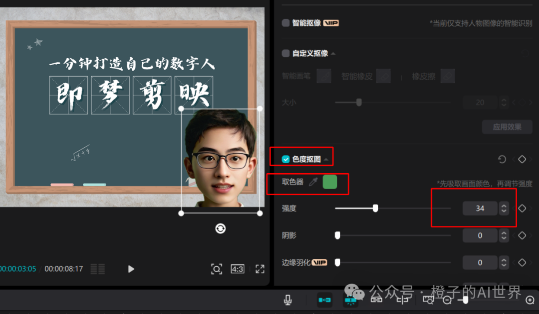 前段時間用即創(chuàng)制作數(shù)字人的文章爆了,但是后續(xù)問題就來了,即創(chuàng)需要加入組織,而且需要在3個月內(nèi)投入廣告才可以制作數(shù)字人,所以對于一些沒有投放需求的用戶來說,這就意味著數(shù)字人的功能無法繼續(xù)使用了。橙子最近研究了一套用即夢和剪映,兩大免費(fèi)的軟件就可以制作出數(shù)字人來。選擇自己一張滿意的照片,最好是可以完整的識別到臉部的。導(dǎo)入?yún)⒖紙D,選擇參考人物長相?!疽韵聢D為例】導(dǎo)入?yún)⒖紙D之后,再寫入提示詞。例如:迪士尼皮克斯工作室風(fēng)格,一個可愛的男孩,最佳畫質(zhì),8K,背景是純綠色。背景這一點(diǎn)非常的重要。一定是純綠色,為了方便后期進(jìn)行摳圖。需要多次嘗試,選出一個自己滿意的數(shù)字人圖來。比如選擇這張,水印是沒有遮住人物的主體部分的,所以非常方便于后期生成視頻,進(jìn)行綠幕摳圖。導(dǎo)入你選擇好的數(shù)字人形象圖片,再寫入要朗讀的文案即可。然后將水印進(jìn)行裁剪,這里可以使用“縮放”的功能。選擇摳圖---色度摳圖--取色器選擇綠色(只需要吸一下綠色就可以)--調(diào)節(jié)強(qiáng)度。就完成了摳圖的操作。其實,用這兩個AI工具制作數(shù)字人相對來說比較簡單,而且使用了自己形象為參照圖,這樣就會避免掉公模相似的問題了。