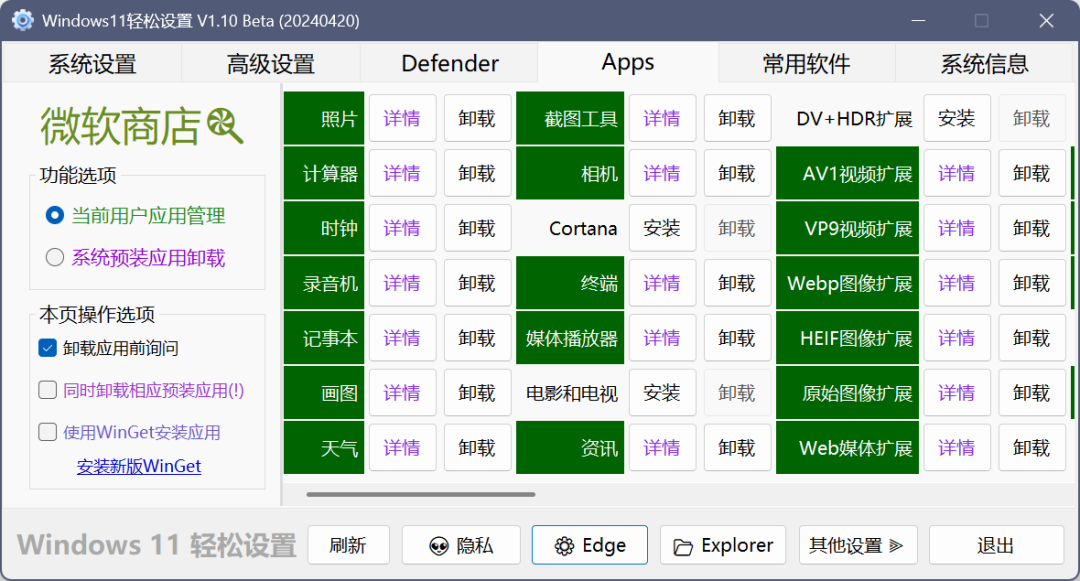2.快速安裝/卸載軟件 windows輕松設(shè)置可以幫助你輕松卸載系統(tǒng)自帶的難用軟件,并且提供常用綠色軟件下載功能,讓電腦在保持干凈的同時安全 如HEVC視頻擴展(我也不知道為啥一個必要軟件微軟商店還要花7元買)