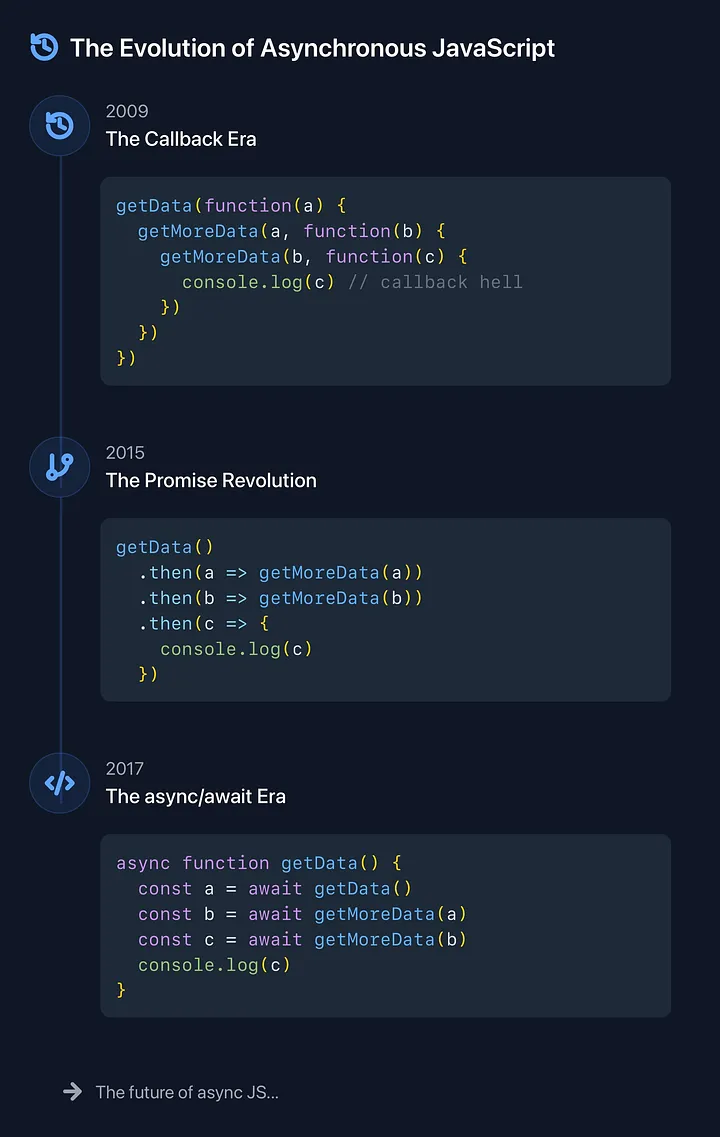 還記得當(dāng)初的回調(diào)地獄嗎?JavaScript 進化到現(xiàn)在,已經(jīng)讓我們避免了深層嵌套的回調(diào)結(jié)構(gòu)。
