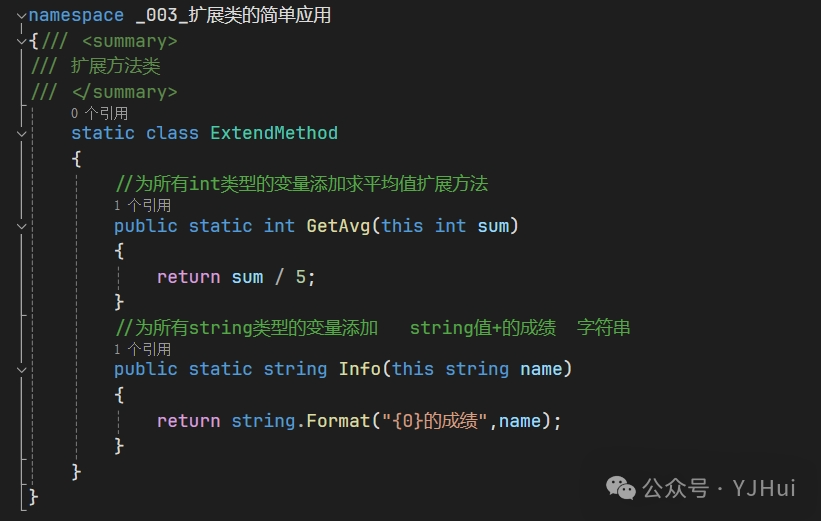 第一個參數(shù)前加關(guān)鍵字this,this后的int/string表示為所有的int/string類型變量添加擴展方法namespace _003_擴展類的簡單應用{/// <summary>/// 擴展方法類/// </summary> static class ExtendMethod { //為所有int類型的變量添加求平均值擴展方法 public static int GetAvg(this int sum) { return sum / 5; } //為所有string類型的變量添加 string值+的成績 字符串 public static string Info(this string name) { return string.Format("{0}擴展類簡單應用",name); } }}
