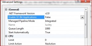 將其設(shè)置為允許,缺點:這樣會使整個IIS上的所有站點都以32位兼容方式運行 然后再運行一下:%SYSTEMROOT%\Microsoft.NET\Framework\v2.0.50727\aspnet_regiis.exe -i 這樣就可以跑32位的程序了。 不過在IIS7上的做法要簡單很多: 應(yīng)用程序池,高級設(shè)置–>允許32位應(yīng)用程序,如下圖: