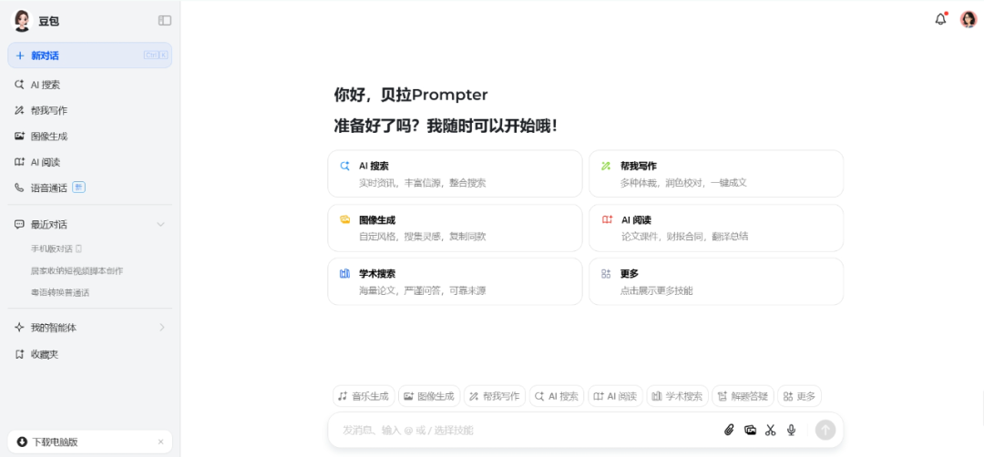2. 基礎(chǔ)操作指南直接對話:像聊天一樣輸入問題 上傳圖片:點(diǎn)擊對話框旁的圖片圖標(biāo) 使用智能體:在首頁選擇合適的智能體 保存對話:重要內(nèi)容可以收藏保存 3.進(jìn)階使用技巧