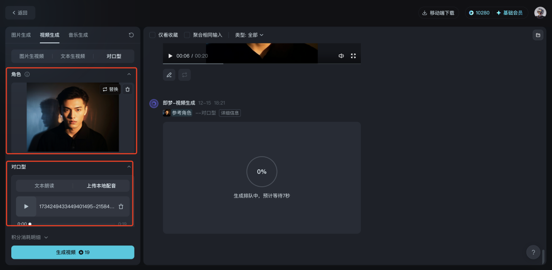 比如,現(xiàn)在我想做一個帥哥用坤哥聲音模仿《大話西游》里面那個經典的片段。然后,跟上周的教程一樣,我們用海螺Audio跑一段坤哥的聲音克隆,然后,讓他來念出那一段經典臺詞:“曾經有一份真摯的感情擺在我的面前,我沒有珍惜,等我失去的時候才追悔莫及。如果上天能給我再來一次的機會,我會對那個女孩說三個字:我愛你!如果非要在這份愛上加一個期限,我希望!是一萬年!”再把我們的帥哥的圖片,上傳到角色那,音頻上傳到語音那。當然如果你不想用克隆的聲音,當然也可以用即夢自己的文本朗讀,它里面默認給你塞了N多音色,你可以選用,可惜就是沒有AI聲音克隆,所以如果對創(chuàng)作有需求的話,我覺得還是可以用海螺跑完,再扔到即夢里。最重要的一點是,在最后的生成效果上,一定要選生動。標準是只動嘴不動頭,看起來就非常不自然,而生動模式是真的嘴、眼睛、頭都在自然的運動,真實也自然很多。