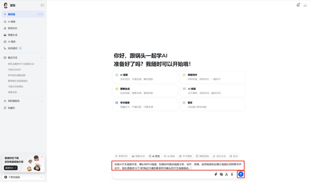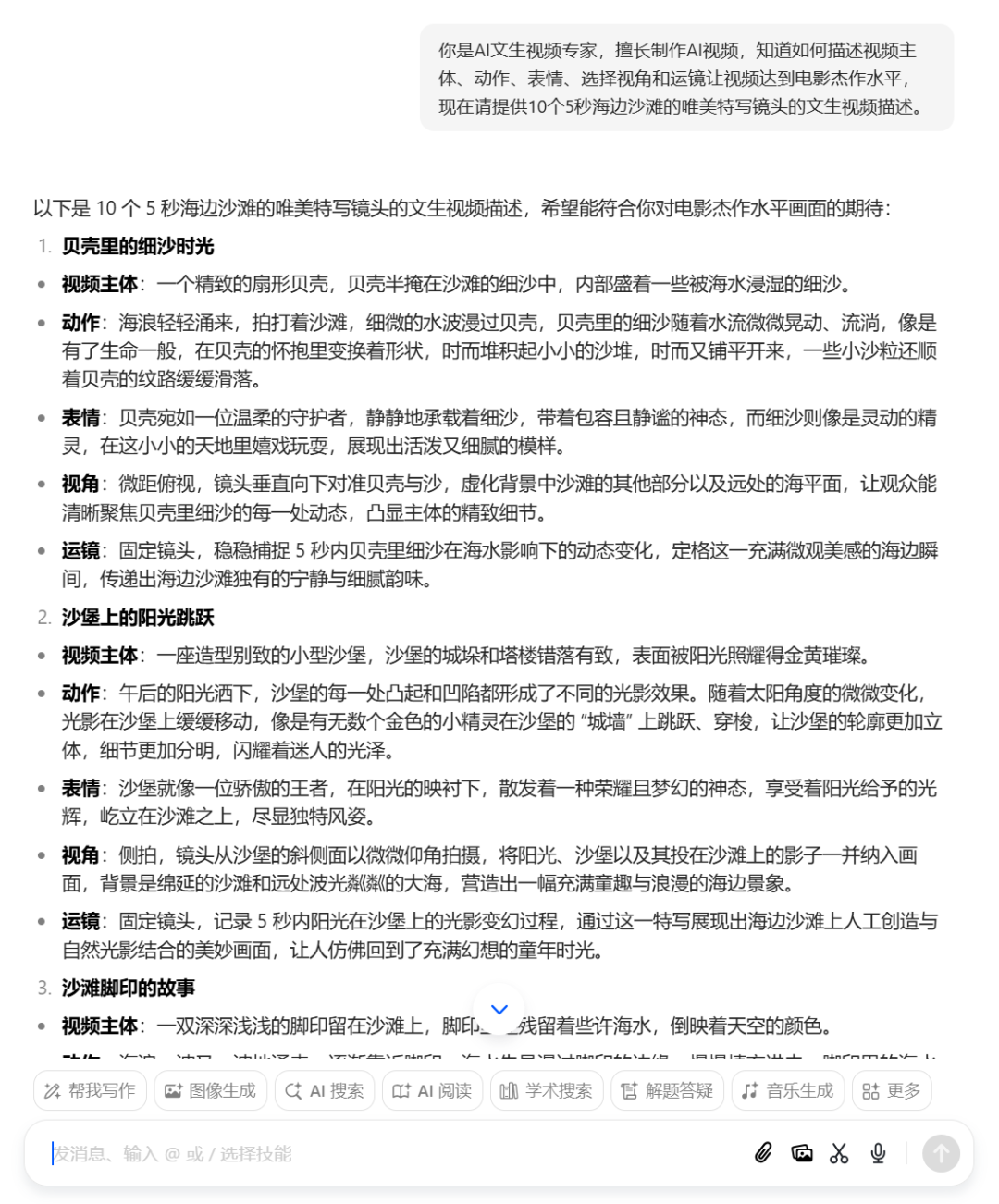 進(jìn)入豆包官網(wǎng)主頁(yè),輸入對(duì)話需求“你是AI文生視頻專家,擅長(zhǎng)制作AI視頻,知道如何描述視頻主體、動(dòng)作、表情、選擇視角和運(yùn)鏡讓視頻達(dá)到電影杰作水平,現(xiàn)在請(qǐng)?zhí)峁?0個(gè)5秒海邊沙灘的唯美特寫(xiě)鏡頭的文生視頻描述。”,點(diǎn)擊【發(fā)送圖標(biāo)】。