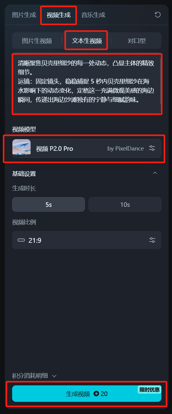 進(jìn)入文本生視頻界面,輸入文本生視頻描述內(nèi)容,視頻模型這里鍋頭選擇視頻模型為視頻 P2.0 Pro,點(diǎn)擊【生成視頻】。