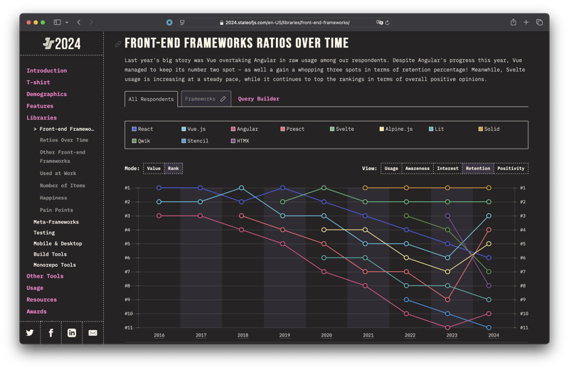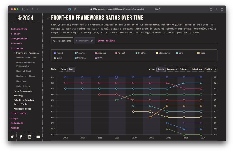 在平日的生活里,決策常常充滿了挑戰(zhàn)。對(duì)于軟件工程師來(lái)說(shuō),不管是開啟副業(yè)項(xiàng)目還是著手大型項(xiàng)目,在正式開展工作之前,我們都得做出一個(gè)至關(guān)重要的抉擇:我們究竟應(yīng)該選用哪個(gè)框架?在 JavaScript 的領(lǐng)域中,這個(gè)選擇尤其困難,因?yàn)閿?shù)量眾多的選項(xiàng)很可能造成決策的停滯不前。 本文將會(huì)通過(guò)對(duì)三大主流框架:Angular、React 和 Vue 的對(duì)比,為您提供幫助,讓您能夠挑選出最為適宜的框架。準(zhǔn)備好迎接一場(chǎng)極具教育意義的比較,對(duì)這些框架在構(gòu)建實(shí)用、可測(cè)試、安全以及高性能的 Web 應(yīng)用程序方面的表現(xiàn)進(jìn)行評(píng)估。 對(duì)于時(shí)間緊迫的讀者,讓我們先從下面的表格開始,提供一個(gè) TL;DR(太長(zhǎng)不看)摘要: 框架的歷史回顧……你還在嗎?太棒了!讓咱們進(jìn)一步深入探討,先開啟一段有關(guān) Angular、React 和 Vue 的簡(jiǎn)短歷史篇章。 在 2010 年,AngularJS 由于具備創(chuàng)建動(dòng)態(tài) Web 應(yīng)用程序的能力,開始備受關(guān)注。等到 2016 年,隨著 Angular 2 的發(fā)布,出現(xiàn)了重大的轉(zhuǎn)變,使得開發(fā)者舍棄了原先的名稱 “AngularJS”。當(dāng)下,Angular 2 及更高的版本就簡(jiǎn)稱為 Angular。 React 在 2013 年首次亮相,憑借其基于組件的架構(gòu)和虛擬 DOM 而嶄露頭角。Vue 于 2014 年進(jìn)入人們的視野,并在 2015 年 10 月發(fā)布 Version 1 之后開始受到關(guān)注。Vue 提供了一種漸進(jìn)式的 Web 開發(fā)途徑。Evan You 創(chuàng)立了 Vue,將其作為 Angular 的精簡(jiǎn)替代方案。 讓咱們從歷史當(dāng)中走出來(lái),把注意力集中在這些框架于當(dāng)今現(xiàn)實(shí)世界里的應(yīng)用。不管您是在構(gòu)建一個(gè)小型創(chuàng)業(yè)公司的 MVP(最小可行性產(chǎn)品),還是一個(gè)復(fù)雜的企業(yè)級(jí)應(yīng)用,到本文結(jié)束的時(shí)候,您將會(huì)清晰地知曉哪個(gè)框架最契合您的需求。作為一名 Auth0 的開發(fā)者倡導(dǎo)者以及前測(cè)試自動(dòng)化工程師,我忍不住會(huì)帶來(lái)有關(guān)安全性和質(zhì)量考量方面的深刻見解。 2024 年 JavaScript 狀態(tài):流行趨勢(shì)的關(guān)鍵洞察在深入探究細(xì)節(jié)以前,咱們先來(lái)瞧瞧這些框架的受歡迎程度。在這一方面,我最為青睞的指標(biāo)是 “JavaScript 狀態(tài)調(diào)查”。由 Devographics 每年開展一次的這項(xiàng)調(diào)查,其最新的結(jié)果于 2024 年底公布 —— 恰好在這篇博客文章發(fā)布的幾天之前。?? 我想特別關(guān)注其中一個(gè)調(diào)查問(wèn)題: