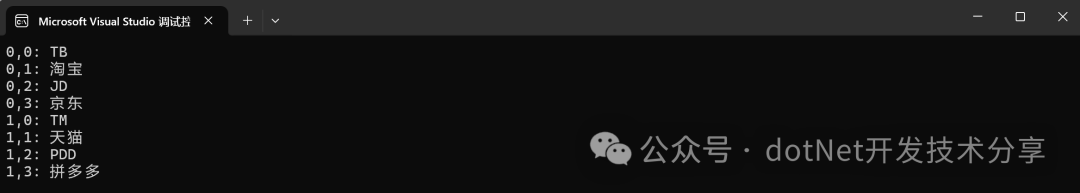 Array platformArrayx = Array.CreateInstance(typeof(String), 2, 4);platformArrayx.SetValue("TB", 0, 0);platformArrayx.SetValue("淘寶", 0, 1);platformArrayx.SetValue("JD", 0, 2);platformArrayx.SetValue("京東", 0, 3);platformArrayx.SetValue("TM", 1, 0);platformArrayx.SetValue("天貓", 1, 1);platformArrayx.SetValue("PDD", 1, 2);platformArrayx.SetValue("拼多多", 1, 3);for (int i = 0; i < platformArrayx.GetLength(0); i++){ for (int j = 0; j < platformArrayx.GetLength(1); j++) { Console.WriteLine($"{i.ToString()},{j.ToString()}: {platformArrayx.GetValue(i, j)}"); }}