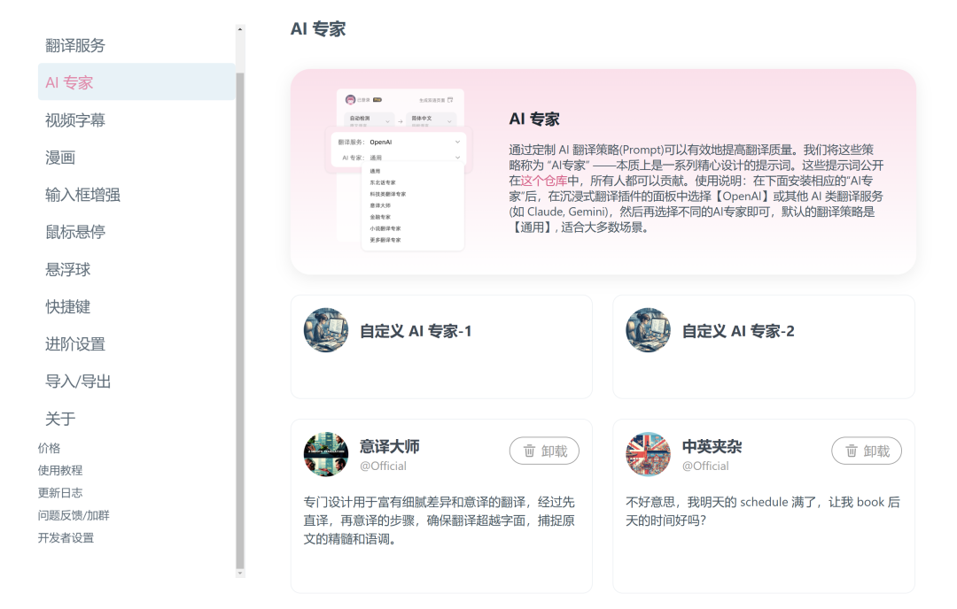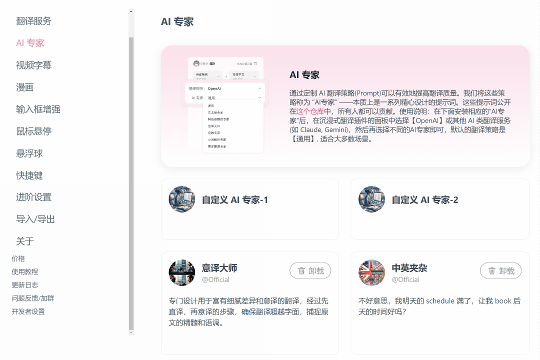 Prompt沉浸式翻譯還有很多Prompt(提示詞),讓不同網(wǎng)站翻譯更加智能準(zhǔn)確。 它自帶很多Prompt,比如像新聞媒體,論文,法律行業(yè),設(shè)計(jì)師等等各行各業(yè)。
