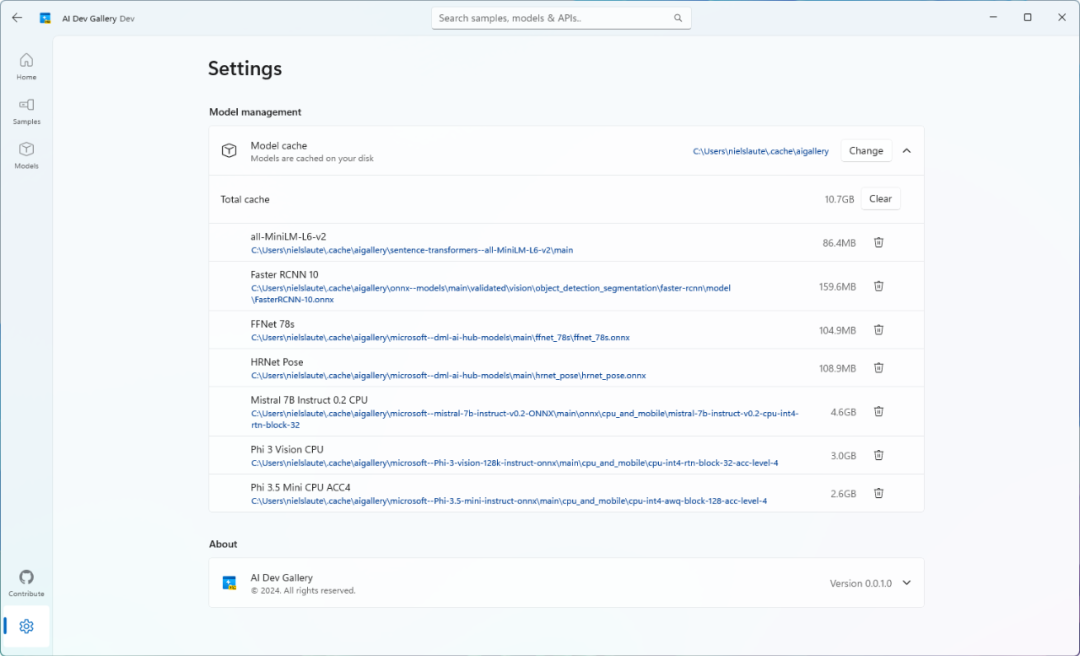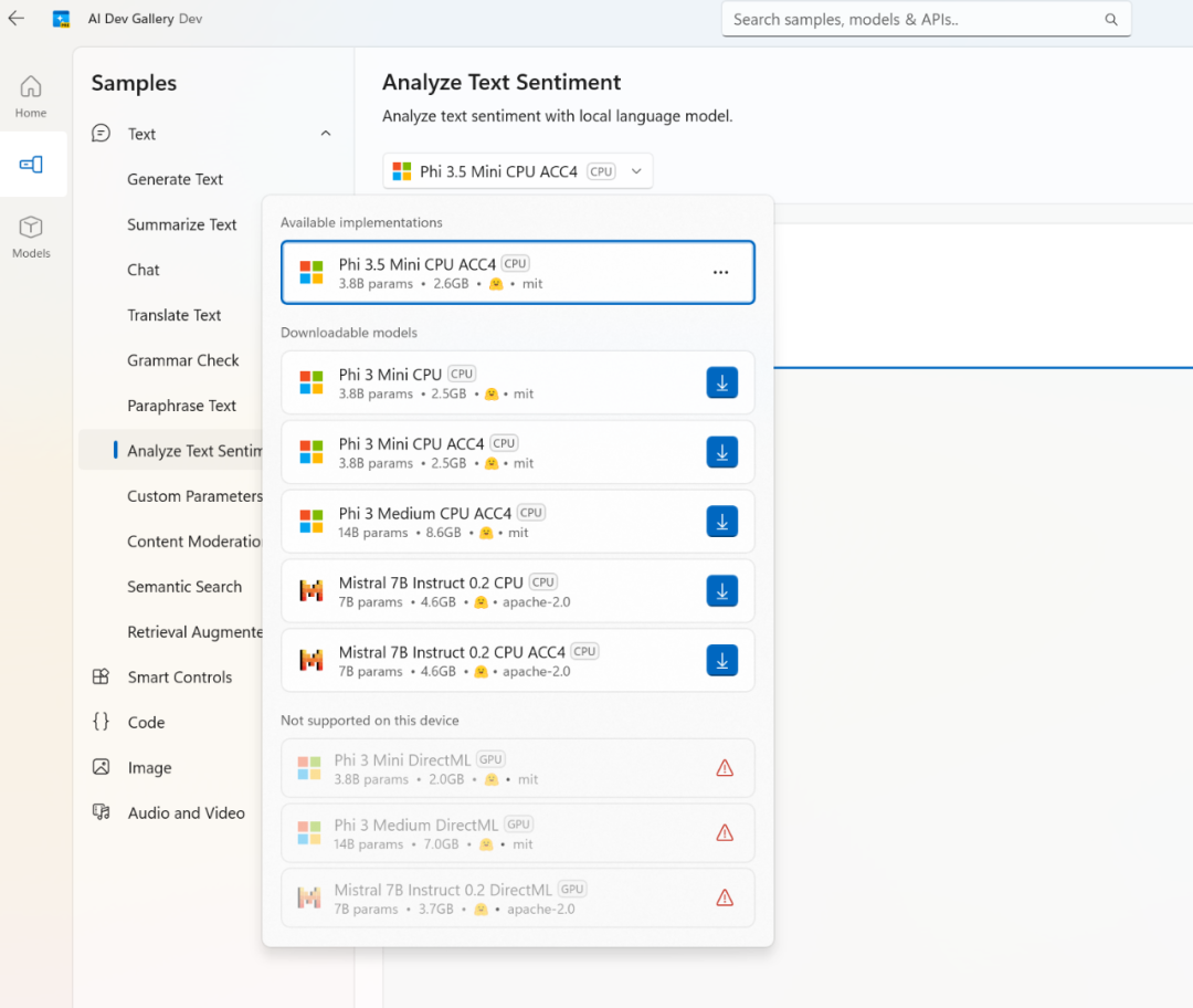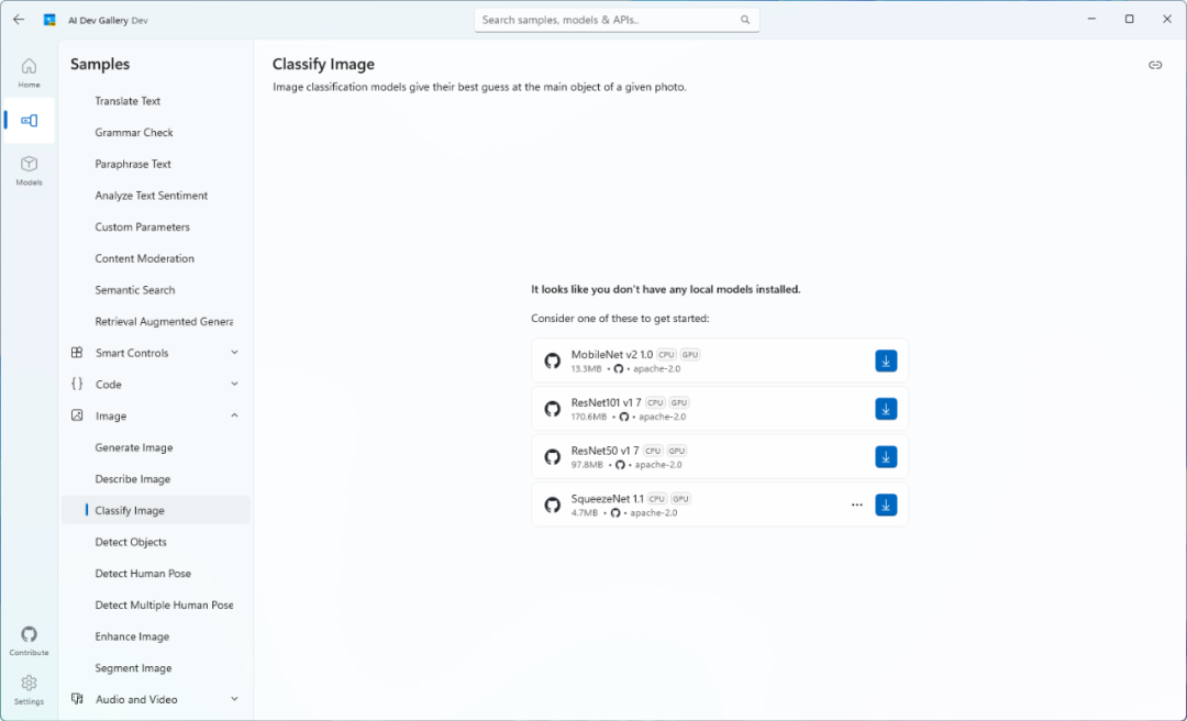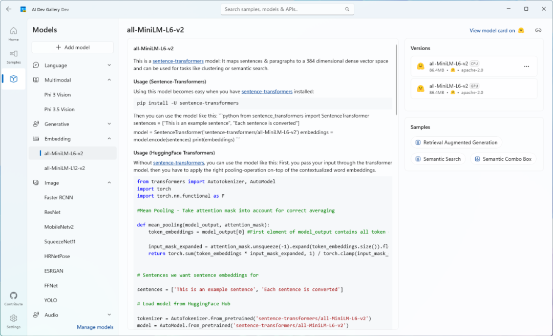 01 項(xiàng)目簡(jiǎn)介AI Dev Gallery集成了來(lái)自微軟自家和第三方平臺(tái)(如Hugging Face、GitHub)的預(yù)訓(xùn)練AI模型。 該項(xiàng)目核心特點(diǎn)有: 1、支持從GitHub和HuggingFace等知名平臺(tái)上下載AI模型。 2、超過(guò)25種不同場(chǎng)景下,通過(guò)交互式樣本測(cè)試不同的AI模型,涵蓋文本、圖像、音頻和視頻等多種應(yīng)用案例。 3、每一個(gè)示例都有完整的代碼,查看每個(gè)示例的所有相關(guān)代碼和庫(kù)引用,方便開發(fā)者更好地理解和應(yīng)用。 4、根據(jù)設(shè)備性能,可以靈活選擇在CPU或GPU上運(yùn)行模型。 02 運(yùn)行環(huán)境要求