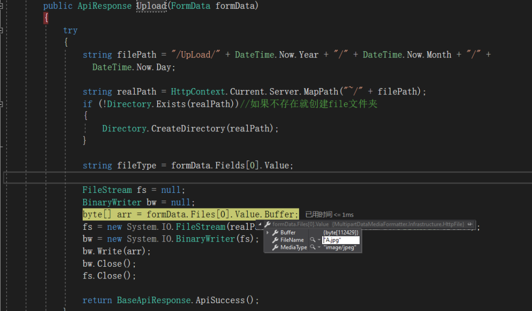 /// <param name="formData"></param>/// <returns></returns>[HttpPost]public string UploadFormData(FormData formData){ try { string filePath = "/UpLoad/" + DateTime.Now.Year + "/" + DateTime.Now.Month + "/" + DateTime.Now.Day;