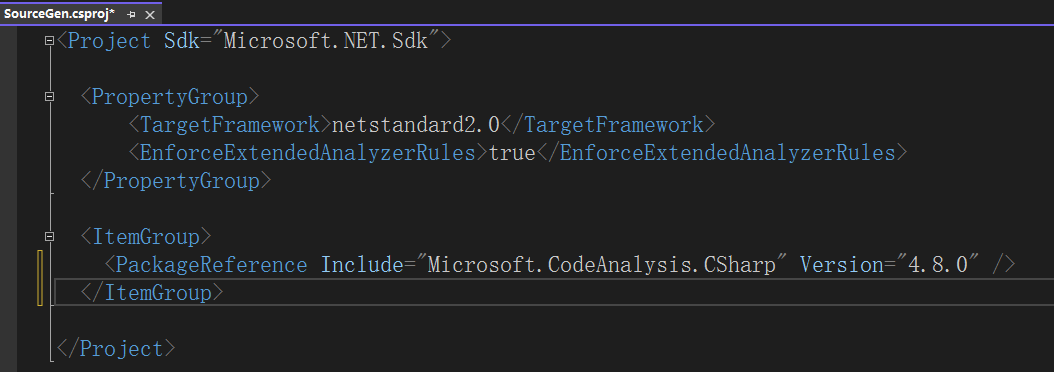 打開項目文件 SourceGen.csproj,在 PropertyGroup 節(jié)點下手動增加 EnforceExtendedAnalyzerRules 配置,如圖: