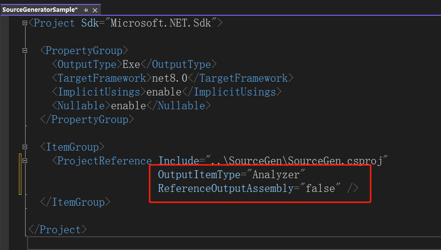 注意,引用后,需要打開 SourceGeneratorSample.csproj,修改項目引用節(jié)點內容,添加 OutputItemType 和 ReferenceOutputAssembly 配置: