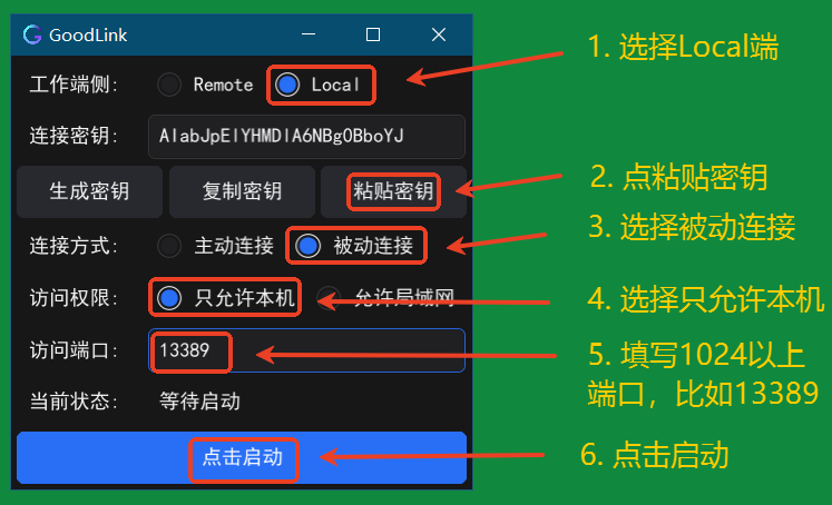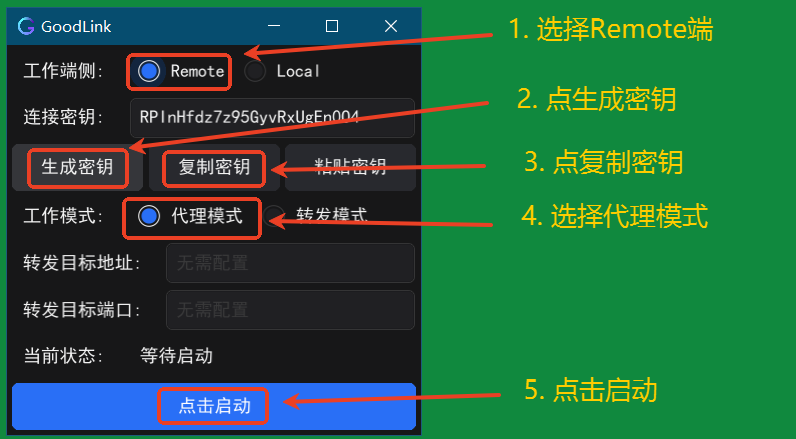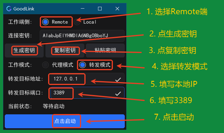 ( linux, Docker )docker rm goodlink -f; docker run -d --name=goodlink --net=host --restart=always registry.cn-shanghai.aliyuncs.com/kony/goodlink --local=127.0.0.1:18080 --key=nas_202412140928 ( linux, 命令行 )./goodlink-linux-amd64 --local=127.0.0.1:18080 --key=nas_202412140928 (windows, 命令行).\goodlink-windows-amd64.exe --local=127.0.0.1:18080 --key=nas_202412140928 轉(zhuǎn)發(fā)模式 - 舉例 1目標(biāo):在家里電腦(或出差電腦),打開 windows 遠(yuǎn)程桌面,連接 127.0.0.1:13389,訪問公司電腦的遠(yuǎn)程桌面。 注:不是所有軟件都支持 Socket5 代理,比如 windows 自帶遠(yuǎn)程桌面,這時(shí)可用轉(zhuǎn)發(fā)模式,將公司電腦的 3389 端口和家里電腦(或出差電腦)的 13389 端口綁定(本機(jī)遠(yuǎn)程桌面服務(wù)已占用 3389 端口)。還有一個(gè)場(chǎng)景,出于安全考慮,只希望 Remote 端指定的主機(jī)端口能被訪問。也可以安裝并設(shè)置通過 proxifier 來曲線實(shí)現(xiàn)任意 TCP/IP 訪問。 remote 端運(yùn)行在公司電腦(windows, UI)注:當(dāng)最下方的按鈕變成綠色,表示啟動(dòng)成功。