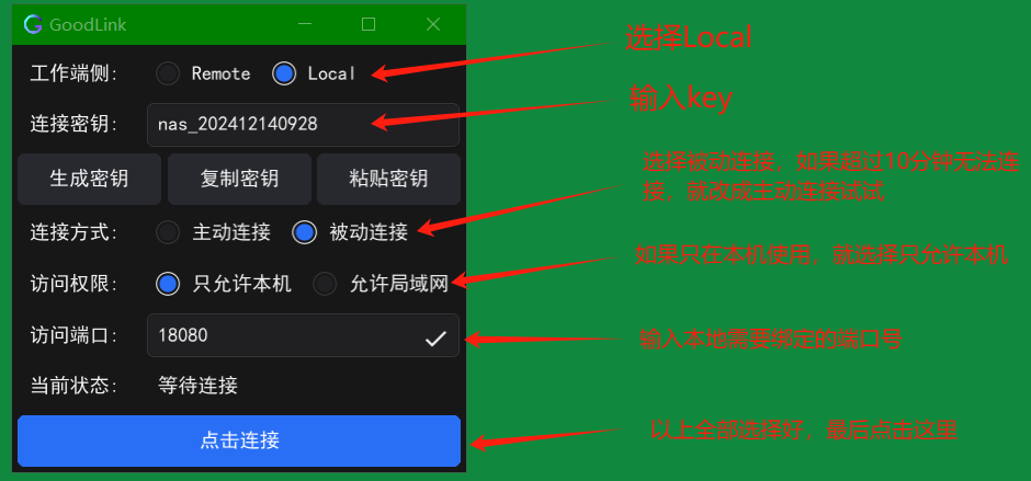 代理模式 - 舉例 2目標(biāo):在公司電腦上配置代理: socks5://127.0.0.1:18080,訪問家里包括 NAS 在內(nèi)的所有主機(jī)端口。 remote 端運(yùn)行在家里的 NAS( linux, Docker )docker rm goodlink -f; docker run -d --name=goodlink --net=host --restart=always registry.cn-shanghai.aliyuncs.com/kony/goodlink --key=nas_202412140928 ( linux, 命令行 )./goodlink-linux-amd64 --key=nas_202412140928 ( windows, 命令行 ).\goodlink-windows-amd64.exe --key=nas_202412140928 local 端運(yùn)行在公司電腦(windows, UI)注:當(dāng)最下方的按鈕變成綠色,表示已連接成功。