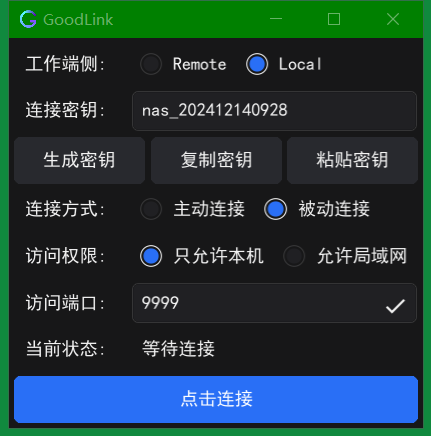 轉(zhuǎn)發(fā)模式 - 舉例 2目標(biāo):在公司訪問 http://127.0.0.1:9999 ,等于訪問家里的 NAS 管理頁面 http://192.168.3.2:9999 remote 端運(yùn)行在家里的 NAS(linux, Docker)docker rm goodlink -f; docker run -d --name=goodlink --net=host --restart=always registry.cn-shanghai.aliyuncs.com/kony/goodlink --remote=192.168.3.2:9999 --key=nas_202412140928 ( linux, 命令行 )./goodlink-linux-amd64 --remote=192.168.3.2:9999 --key=nas_202412140928 (windows, 命令行).\goodlink-windows-amd64.exe --remote=192.168.3.2:9999 --key=nas_202412140928 local 端運(yùn)行在公司電腦(windows, UI)注:當(dāng)最下方的按鈕變成綠色,表示已連接成功。