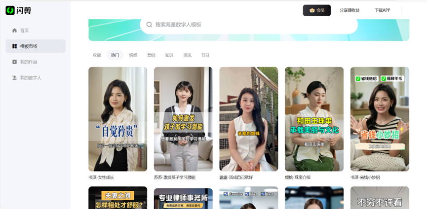 網址:https://ruying.shyuhuankj.com/home/index 6 閃剪 閃剪是 AI 數(shù)字人口播視頻生成工具,用戶上傳大于 30 秒的視頻,就能 1:1 復刻形象和聲音,輸入文字即可一鍵生成口播視頻,可幫助打造個人 IP 矩陣,且鑲嵌了 1000 + 數(shù)字人模特,適用于多種自媒體平臺。功能需要付費,可選擇使用