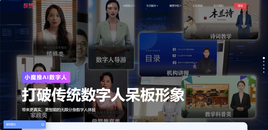 7 小魔推 AI 數(shù)字人 小魔推 AI 數(shù)字人運用多種 AI 核心技術,提供多場景虛擬人解決方案。用戶利用真人出鏡口播視頻、在線錄制真人語音、輸入文案等三步,即可生成專屬數(shù)字人形象,解決出鏡、文本、成本等問題,且數(shù)字分身的服裝、動作、表情等與真人視頻一致,,口型與文案匹配,克隆的聲音模型也與真人音色高度一致。通常與相關營銷服務套餐綁定,詳情咨詢對應商家。它號稱“打破傳統(tǒng)數(shù)字人呆板形象”,功能十分健全強大,需要的伙伴可以自行去嘗試構建.