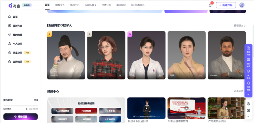 網址:https://bao.360.com/flowBaoApp?id=3857&platform=douyin 9 有言 有言是專業(yè)的 3D AI 數(shù)字人創(chuàng)作平臺,在 3D 數(shù)字人領域那可是相當有一套。它最大的優(yōu)勢就是 3D 數(shù)字人形象庫極其豐富,不管你想要打造什么風格的虛擬形象,時尚潮流的、古風古韻的、二次元萌系的,基本都能在里面找到原型,滿足絕大部分對于 3D 數(shù)字人口播視頻的需求。