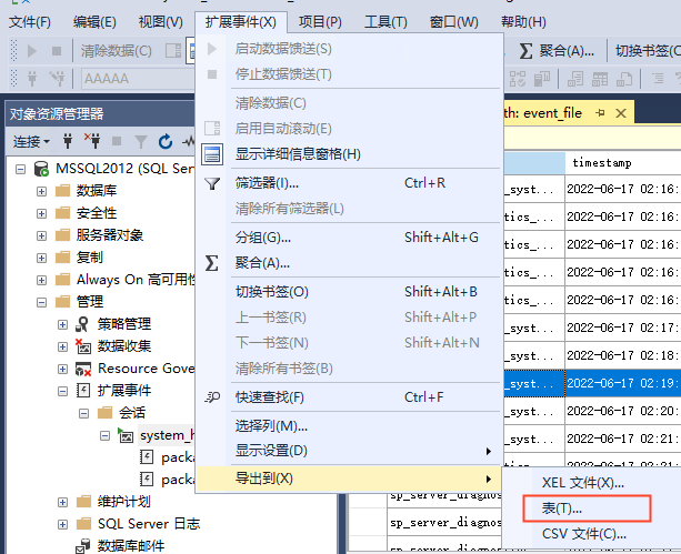 【擴(kuò)展事件導(dǎo)出到表】 擴(kuò)展事件跟蹤的一些信息,可存在緩存或文件中,但是臨時(shí)查詢或分析時(shí),讀取是比較麻煩的。SSMS 提供了一種臨時(shí)導(dǎo)出擴(kuò)展事件到表的方法。