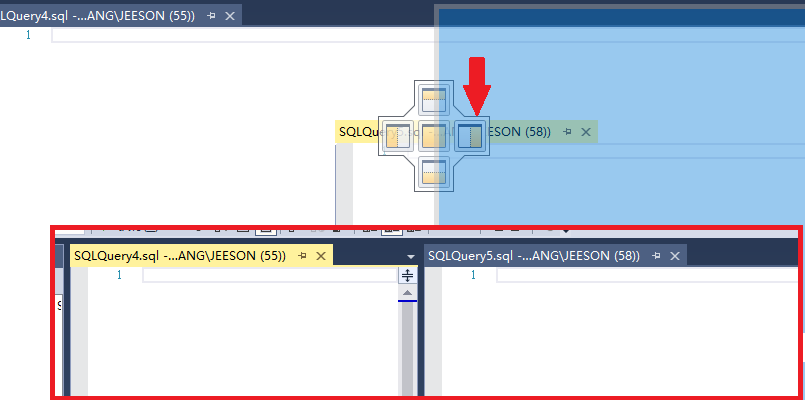 【分屏】 當(dāng)打開多個(gè)查詢窗口時(shí),又想同一界面查看,可以點(diǎn)擊查詢窗口的“Tab”欄進(jìn)行拖動(dòng),可放置在不同的方向位置上。如下圖,將2個(gè)查詢窗口分別顯示在左右側(cè),可同時(shí)查看,方便對(duì)比。
